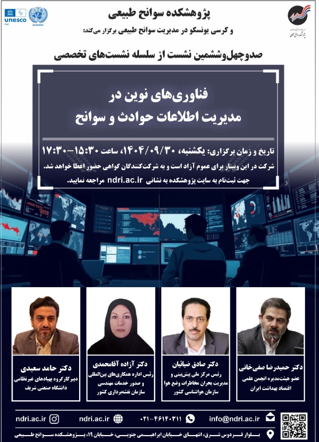 نشست فن آوری نوین در مدیریت اطلاعات حوادث وسوانح ۳۰ آذر ۱۴۰۴ | ۱۲:۰۴ کد : ۵۷۱۴۹ اطلاعیه ارسال به دیگران نام شما ایمیل شما ایمیل دریافتکننده ارسال انصراف تعداد بازدید:۱۵۶۰ دعوتنامه نشست فن آوری نوین در مدیریت اطلاعات حوادث وسوانح