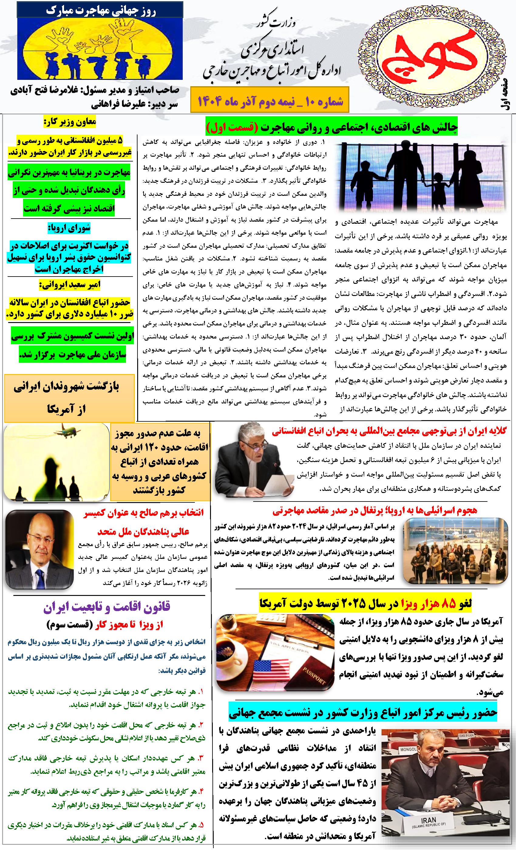 دهمین شماره نشریه کوچ ۰۳ دی ۱۴۰۴ | ۰۹:۲۱ کد : ۵۷۵۲۰ اطلاعیه ارسال به دیگران نام شما ایمیل شما ایمیل دریافتکننده ارسال انصراف تعداد بازدید:۲۵۵ دهممین شماره نشریه کوچ، توسط دفتر امور اتباع و مهاجرین خارجی استان مرکزی منتشر گردید.