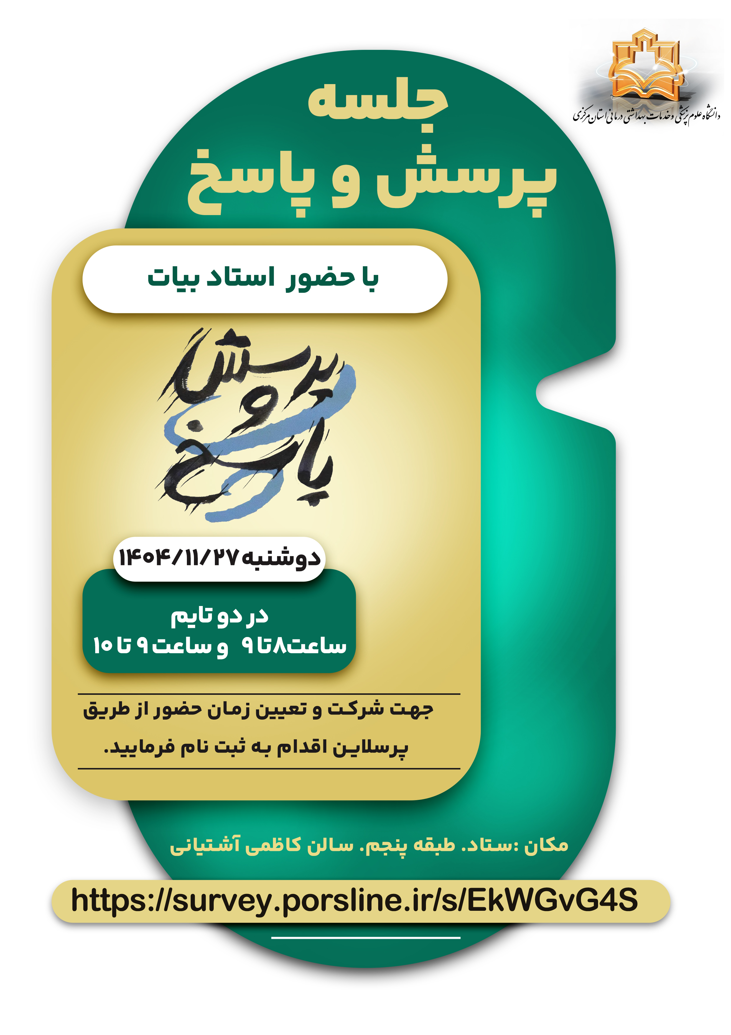 جلسه پرسش و پاسخ ۲۶ بهمن ۱۴۰۴ | ۱۱:۱۴ کد : ۵۸۰۰۷ اطلاعیه ارسال به دیگران نام شما ایمیل شما ایمیل دریافتکننده ارسال انصراف تعداد بازدید:۳۱۷ جلسه پرسش و پاسخ، با حضور استاد بیات برگزار می گردد.